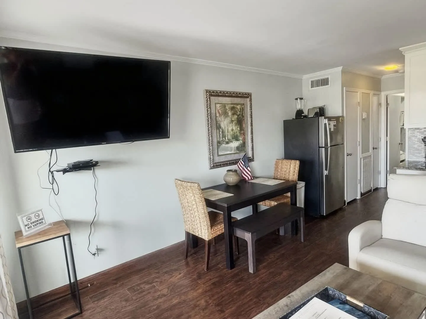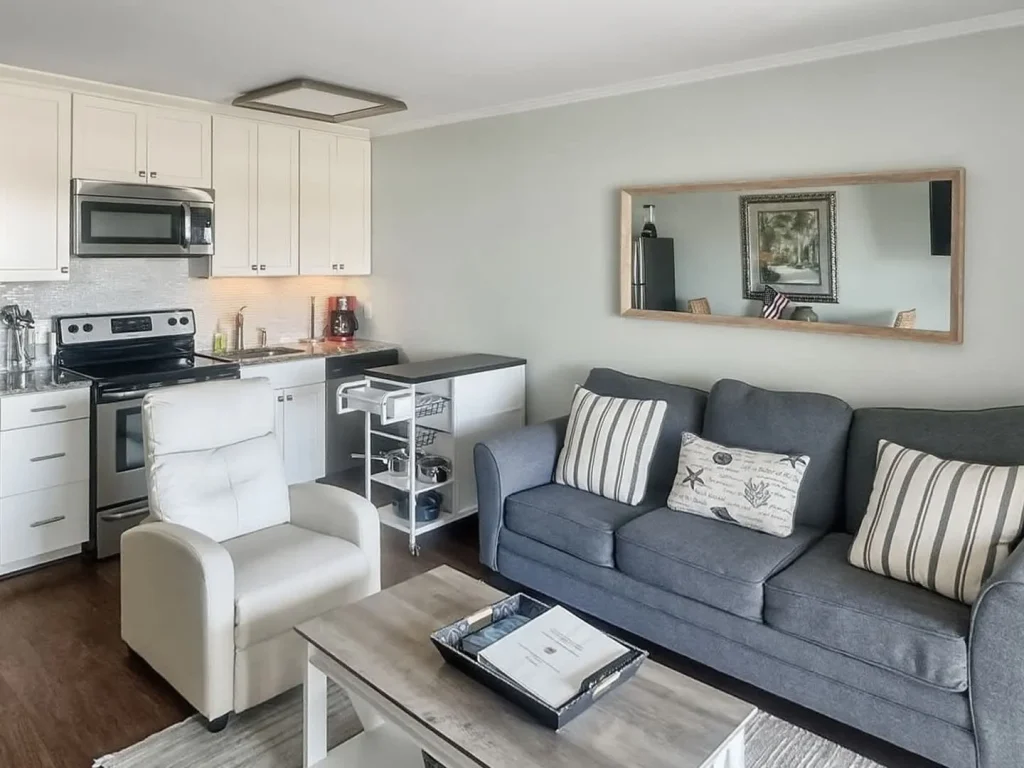 Living & Dining: A sun-drenched open-concept area featuring a queen-sized sleeper sofa, flat-screen cable TV, and a dining nook.